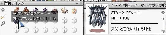 RO【ただの日記編】 2009/05/16 なんか売ってたので 衝動買いに近いもの…かも 5Mだったんで、+4だけどまぁいいか的な感じで購入。 作るとしたら+6くらいで作ろうかと思ってたんだけど、カード高いしこれならカード単品よりも安いし損はしてないかな。 多分安全圏&転生の剣士系、商人系、盗賊系しかつけれないからっていうのもあって、処分しずらそうですね。 でも精錬値は正直なところ結構どうでもよかったり。 使う主な目的はバーサクですし、DEFもMDEFもゼロなので関係ないのだ。 だからオーディンは売り飛ばしたわけで、その点このD鎧はいい感じ。 軽い。ステ補正がある。MHP+150なのでバーサクするとMHP+450かな? 他使うとしてもAXは避けるし、WSも避ける狩場か回復たたいてのCR狩りかなので。 それにしても今日は眠かった…。