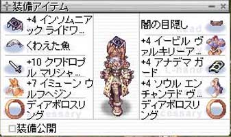 RO【ただの日記編】 2010/11/05 買ってみた イグD用っていうか、闇V鎧買ってみた。 闇が一番使えると思うし。 これでイグDとスカラバ行った。 まったくスタンしなかった…。 なので結構抱えても平気だった。 イミューンウルフヘジンも噂通り良い仕事してくれる。 難点といえば、イグDは火力がちょっと低い。 他の影葱さんは7k以上ダメージ出してた。 スカラバは死ぬ間際にメマーを撃つAIらしく、火罠だと死んだあとにメマー喰らう判定になるっぽいので、一斉に同時メマーが来て一気に体力もってかれるので赤ゲージになる…。 それを考えてMOB調整しないと、調子乗って集めると死ねる…。 昔しめじさまに釣られて騎士団はまってた時にV鎧買うか悩んでたけど、結局買わずだったが買っておけばよかった。 たしかあの時20M以下だったはずだもん…。 まぁでも高くなるわなーって思った。 メランコSpPが封じられて産出が減ったっていうのも理由らしいとか聞いたけど。