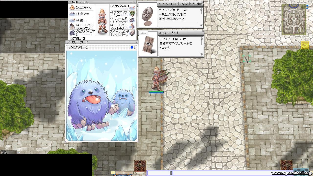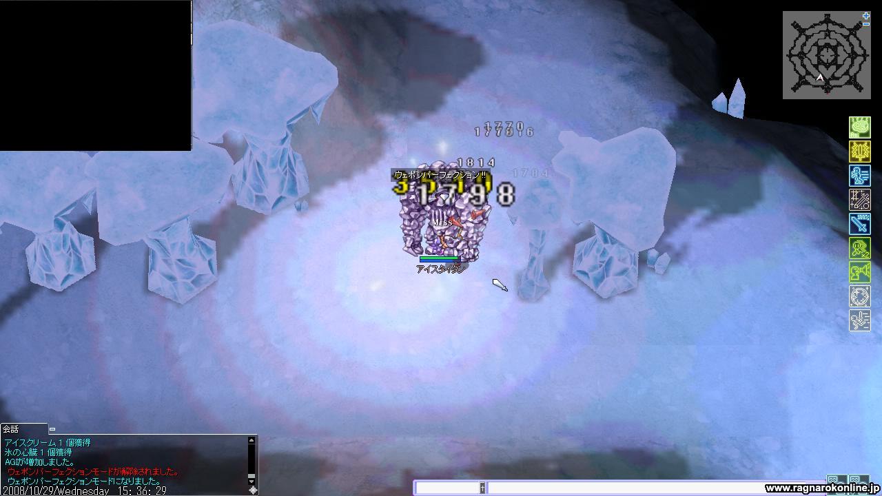RO【ただの日記編】 2008/10/30 【FAR狩】氷Dでやってみた 昨日、FAR取得したので氷D3Fへ行ってみました。 …しかし。 入り口人多すぎた…。勿論中もだけど。 この1.5倍でスリッパ、氷Dとソロでアクセスも簡単でそこそこオイシイ狩場は混みこみモードですね。 スリッパは1確が多いので、ある程度人が居たらその分沸きがよくなって回転率もあがる感じで自分的には気になりませんでした。 時々チマチマ狩りしてる人とか、2PCでプリ壁にしてのアサシン、ローグさんとかがいらっしゃるのでその時はモゴモゴってした感じになってる気がしますけど。 氷Dはあれですね…鬱陶しいゲイズティとかが多くて、しかも無視して飛ぶ人が多いので溜まってたりとか道も狭いのでかなりイライラしますね;; 実際普段より狩れなくて1.5倍の意味ない…って感じな気もしないでもないです。いつもの事ですが…。 早朝とかはそれなりに狩れるかも?行ってないからわかんないけど。 それと、やっとWSが80になったから、カートに眠ってたスノウアー挿しました。 コンチは合計4個もってまして、2個はコボルド挿し。 1個がスノウアー挿し。もう1個はスノウアー挿すか悩み中です。 実際使ったことなくて噂のみだったのですが、本気でスノウアーやばいですね。 まず回復量が凄すぎた。あとドロップも。 95%回避の狩場だと残る5%分HITした位なら、使用しても帰りには増えてるって感じですね。 2個つけたら本気でほとんど被弾しない狩場だと重量オーバーで捨てることになりそう。 アイスは重量がPOT系に比べて軽いことと、安い事がメリットですね。 普通のNPC販売タイプだとOC効くけど割高、アイス商人からだと100zだけど10個ずつで買いにくい。 と思われていたアイスですが、モロク崩壊と共にピラ前のカプラ近くで100個まとめ買いできるようになりました。そのままカプラに放り込めるので楽チンです。 ※追記 ここがアイス売り場です。