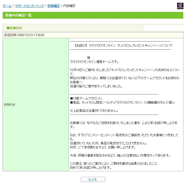 RO【ただの日記編】 2008/10/30 これはヒドイ。けどワラタ うおおおおおおおおおおおおおおお!!!!!!! ずっとメールみてなかったんだあああああああああ!!! そしたら運営からメールが来ている…だと…? さっそくサポートのところを見てみる… 何っ!!?こないだのワンデイチケットキャンペーンの景品が当たっているだと!!!? 前の子悪魔帽だとか、なんかこういう景品は良くあたるなっ! へへへ って思って期限みたら、申し込みする期限すぎてた笑 …しかしそんなことじゃないんだ もう一通新着があるぞ… ポチっ まちがっていた…だと…?