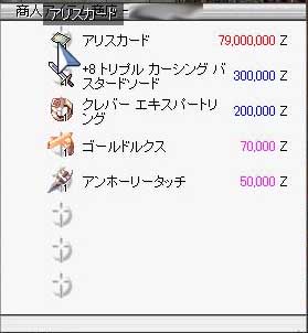 RO【ただの日記編】 2008/10/09 相変わらずちっこい人間だた 今日寝る前、露店で+7ハトブレ買いチャしてる人がいた。3Mだった。 自分の時もすでに全盛期を越えていてそれくらいで、ハトブレの未精錬も売ってないから自分で作るにも作れず困ってたんで、見つけときに作ったり買ったりしてたのでカートにカード挿さってないのを置いてたんです。 時々露店にも並べてたので、売る気が無かったわけでもないんですが何か手放すのが寂しい。 が、同じく困ってるのかなぁー?と思って売りました。 凄い喜んでくれたので(本心はワカラナイケドw)よしとしよう。 でもこれで、何か新しいカードを挿したくなっても予備がないわけで… 売らなければよかったかなぁ…なんて後で思ってしまう相変わらずちっこい人間だた それにしても最近はLV4武器でも+7がデフォですよね…。 LV3でも+8がデフォなカタールや、ツーハンドアックスとかもありますけど! あれって性能なんですかね?それとも値段なんですかね? LV高くになるにつれて精錬の恩恵が大きいし、それがデフォになったら困りますよね…