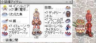 RO【ただの日記編】 2008/09/21 WSスリッパデビューしました。 実は昨日からWSがスリッパデビューいたしました。 無論CT1確狩り(錐+火付与)です。 BSでメマーで1確は敷居が高く、ダブルサイン(今だとアイアンリストでもいけるかな?)でSTRが120キープじゃないと難しい1確狩りですが、WSの場合はカーとターミネーターがLV10で1333%の高倍率なので、自分のWSはまだ素STRが70ですが余裕の1確です。 アサクロもINT先行で早期Sbrスリッパ1確で中盤時期を過ごしたので、WSも中盤をスリッパで過ごそうとSTRは先行して確保しておきました。 DEXは30ですがWSBSの場合、武器研究が実質HIT+16なので必中です。 当初はオーバートラストマックスを使用しないと難しいかと思っていたのですが、普通のOTでいけましたので赤字にはならずに済みました。武器も破壊確率低いし、WP取得したのでそろそろOT無しでも1確できそうです。 他の完全に収入に繋がる職と違い、出費ありきの狩り方ですが大体今日1時間狩って見て200k~300kほどの利益はでました。 ノーディレイ、無詠唱で連打可能の為沸いててもサクサク狩れて、CT→グリードがすぐ出るのでかなりの回転率で周ることが可能なので30分で80個くらい拾うことができました。 そんなこんなでスリッパ狩り用の装備はこんな感じです。 昨日は、頭がワイズ修了帽、いたずら妖精、ヨヨクリ×2、プパ聖服だったんですが、95%回避とかじゃないので時々なる石化。暗闇。睡眠が邪魔だと感じたので服は倉庫でホコリかぶってた弓ローグ時代に使用していた不死メントルを。あとは目隠しをひっぱりだし、頭はアサクロの時に馬挿し衛星使ってたのですが重いしもう使わないと思って売ったのですが、昨日ふと覗いた露店で電球が昨日1.5Mで売ってたので買って、ナイトメア挿して作りました。 そんな装備買うの無駄金すぎるって?快適感の方が重要だったのでそっとしておいてあげてくだし…。 これで、暗闇、石化、睡眠と無効でサイト使用可であぶりだしが出来るので満足です。 何故電球にしたか。それはアクセサリー欄はアカデミーを使いたかったから。 別にサイトが無くても狩ることはできますが、あったほうが便利なので。 回復剤は大量に固まってる所でCR連打をしない限り要りません。 お魚は手持ちが増えていく感じです。装備は武器以外どこ変えても1確は代わりないので、ドロップ系のアクセとか付けたらおもしろいかなぁーなんても思いますが、元取れる値段を考えると単品狩りなので微妙かと。 とりあえずBASEが80になるまでスリッパで頑張ろうと思います。 それ以降はFLEEがそこそこ高くなってると思うので普通の狩りへとSD5Fとかでも行こうと思います。 WSの場合はハトブレ担いで普通にスリッパも殴り倒せるみたいなので、考えてみます。