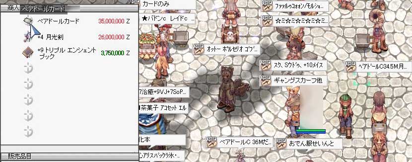 RO【ただの日記編】 2008/08/05 ちょっと安くなった? む… 最近色々クジだとか、オマケだとか仕様変更だとか多すぎて情報とってくるの遅かったら損しそうで怖い日々であります。 夜から次の朝になって数M値段が落ちているとかいうのも時々見るので、買うか買わないか凄い迷う…そして買わない…そしたら、買っとけばよかったとかいうのも多い…。 1個目ベアドール35Mで発見した。 土日でも安くて37Mくらいだったと思う。大体出てるのは40オーバーだった気がする。 売れるときは速攻売れるし、買取も40オーバーで出てることも多い。 が、今日この35M見て買おうか悩んだけど、その画像見ても分かるとおり他にも数点同じくらいの値段で置いてるところが幾つもあった。 これはなんでだ…?ちょうど来週?再来週?くらいにコミケが近づいてきたからだろうか? しかしうちのサーバーでどれくらいの人が行って、どれくらいの人が買って、実際どれくらい出るのか。全く分からないので怖すぎる…。 ホドレムリン待ちでアリスもベアドールも買わないでおこうかと思ったけど、やっぱり全然ダメが違いすぎた。 アリスは正直、アヌビスcが出たから正直トール3ペアとかじゃないと必須ではないと思うし、付け替えが上手い人はアリスなしでやってる人もいるし、自分の中での優先度は低い。が、ベアドールはアコ系以外だとやっぱり現状欲しいな…。