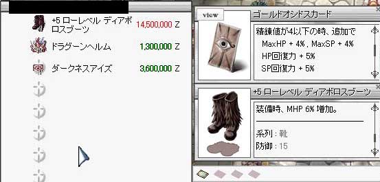 RO【ただの日記編】 2010/10/18 ねてた 昨日記事書いてたら寝てた、そして書いてる途中で消したっぽい。 おわた。 という事で簡易。 チェイサーのアカデミーが外れた。 SPがかなり減って困ったので徐々に値下がりしてるDリングを 買った。 朝の時点で29売れ残り、夜には28、27と安くなって行ってて売れ残ってたから強気の25M買取したら即効来た。 もう1個欲しいけどそんなお金はない。 アリストのライドワード帽(スタイナー挿)が安く買い取れたら、Dリング2個使ってローグセット作るんだ…。 短剣、剣チェイサーならHIT確保の為に呪い手でもいいかもしれない。 ローグセットSP消費20%カットなんだ。 忍者セットもSP消費20%カットなんだ。 しかし両方は両立できないんだ。 忍者セットは重いのが弓葱には難点。ランブリセットも使いたいしね。 しかしローグセットはアクセ2個塞がれるけどな! ちなみにウルセットと忍者セットも両立は不可だが、ローグセットとウルセットは両立可能。 するとSP消費30%カットになる。優秀。 しかしオデンが重いので弓葱には難点。短剣なら良いかもね。 ランブリも付けれないしね、短剣なら重量持てるからドラゴンセットもありだけど。 コスト抑えるために当初弓パッシブでニア過ごそうと思ってたけど、知らぬまに弓BB狩りになってた。 宿のお金がいつまでもつか…。 でもAGIは70止めしてたのでよかった。VITは安定の為と回復剤有効活用の為にとりあえず40で止めてる。 ニアBBだけならこれ以上はイランかと思った。 とりあえずDEX99にして、他ステはパッシブで狩るならAGI、あとは重量増やすためにSTRか、コストを少しでも抑えるならINTだなー。 どうせ影葱になったらリセットできるから結構適当に考えてる。 ニア4に飽きたから違うところ探索してた。 ここ、すごいすいてる。 弓葱っていいなって思った。 だって反射ついてるMOBにはDS連打で処理できる(パッシブでも良い) それ以外はBBで良い(パッシブでも良い) ここだけじゃなくてもSWやニュマも対応したもの使えるから、結構楽ちん。 属性も矢交換で対応できるしね。 やっぱり上位弓は実装されなさそうだけど、色んな意味で弓がいいかなー。 短剣も盾ペナ付いたしね。剣型もHIT確保に最近は素DEX60は最低でも振ってるみたいだし。 そうなるとステ圧迫するから、やっぱ弓が良いかな。盾持てないけど。 影葱になってスナッチャーしたいから剣影にしようと思ってたけど、VIT弓でいいや。罠も出来るし。 パッシブも考えてたけど、弓葱でやってみて思った。 メカニックに勝てるパッシブ職は無いと思う…。 1時間100k使うけどOTM強すぎる。 高ASPDにするのも容易だし、高ATKだし、荷物沢山持てるからアイスバリアで硬いし、強い範囲スキル出来たし、アイテム簡単に拾えるし…。 なので、パッシブはメカ1人で十分。 ローグ系は折角盗作があるのだからそれを生かせる型にする。 ギロチンクロスもそのうちスキル型にしようと思う。クリ型でもいいけど…。 そういや今から買う人あんまりいないかもだけど露店に危ないもの並んでるので気をつけてね。 これ。 ローレベルなのに+5になってんの。 無意味だから。 値段的にも明らかに相場違いな売る気なさそうだからネタなのかもしらん。