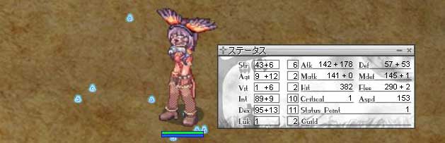 RO【ただの日記編】 2010/10/11 おわた 今朝2時間ほどやって残り50%あげきった。 最終的にはこんな感じになった。 最終狩場として使ったところを想定してなくて、ピンギ用に1確まで適当にDEXとINTは振った。 もっと敷居低いかもしれない。 レベル上がった分だけ適当に振ってたから…。 それ以降はSTRに全振りして重量を底上げした。 即効転生させて シーフハイになった。 満足。 ここからはボチボチ行こう。 あくまでも1PCにこだわったので、倉庫もあけれないしアカデミーも付けれないから懐かしのポリンとか叩いてた。 チェイサーは何型にするか迷い中。 JOB欲しいならゲフェニア行けるように弓型にしようかと思うんだ。 けど、手っ取り早くレベル上げたいなら盗作罠型にしたら早いと思う。 しかし、ぼちぼちスナッチャーで短剣で育てたいとも思う。 困ったねー。 以上、作成して三日間の戯れでした。