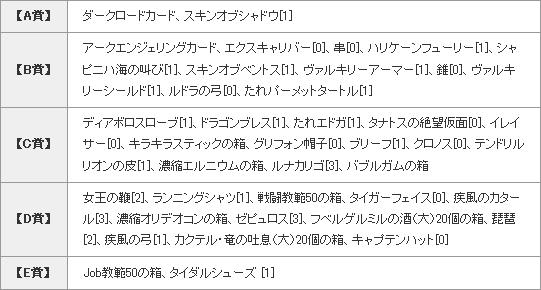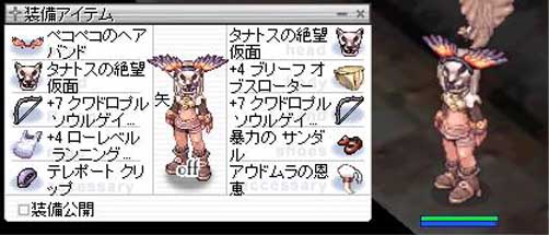 RO【ただの日記編】 2010/09/22 らぐクジ発売&先輩用装備実装 らぐクジの前に、噂をしていた先輩用装備がやっと実装された! ラグナロクオンラインゲーム内アイテム「ウンバラの魂[0]」 (1個) -ステータス- 【系列】兜【装備位置】下段【DEF】1【MDEF】0【精錬】不可【スロット】なし 【装備レベル制限】30【破損】する【重量】20【装備】全ての職業 【特殊効果】Vit + 1。[にく]の回復力 + 25%。 モンスターを倒した時、一定確率で[にく]をドロップ。 見た目はキャラクターシュミレートサイトでも見てください! で、らぐクジ。 予想してた物は入らなかった…。 たれパーメットと、タナトス絶望仮面という新装備が追加された。 絶望仮面はちょっと欲しいな…。 性能は公式サイトでも見てください! sランブリセットは、次のアップデートのドラゴンセットの劣化になるから安く出回るかな? 重量面ではランブリの方がだいぶ軽いので弓手スレではドラゴンはあんまりって感じだったなー。 どっちみち実装されても高いだろうしね。 この際だからローレベベントス持ってるけど、自分もランブリセットを買ってみようかと思う。 シャツが安いので、マルス、ジャック、ダスティネス等の属性系を作ろうかとね。 ベントス実装時は属性ベントス欲しかったのだけど、高いからもったいない…。 一応属性系ってFLEE+5ついてるから、セットでFLEE+20の装備になるんですよね。 リニューアル後は魔法が痛くなったので、ちょうど欲しかったんだ。 これ付けるキャラ=AGI系なので、とくに痛い。 それと、殴りMEAB用にカーサ挿しが欲しいのだ。ネタだけどな!! ブリーフはDEF低いけど、地デリ空デリの使い回し用に欲しかったから丁度よかった。 なので作ろうと思うのは 地デリブリーフ 空デリブリーフ 闇ブリーフ 弓セットブリーフ の4種 火、水、風、念ランニングシャツ ローレベルランニングシャツ カーサランニングシャツ 弓セットランニングシャツ の7種 他欲しいのは、ルドラ弓、グリフォン帽かなー。 と、D服が安くなるんだったら水と風も作っとこうかなって感じですね。
