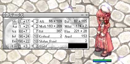 RO【ただの日記編】 2010/08/12 やっと 今更ですが このわたくしもやっと発光しました。 ってSS取れてないけどナ… 必死すぎてとれなかった! 早くABになりたいーって事でJOB稼ぐならニアだろってココバが連れて行ってくれました。 ココバ、よしお、先輩、ハモとか色々手伝って下さって順調にJOB稼いでおりますが@46%でございます。 ちょっと前で言えば狭間臨時とか、今で言う棚臨時に行けばすぐだろ?って話かもしれませんが、基本的には臨時には行かない人なので縁がありません。 ペアトリオくらいなら昔ちょこっと行く時期がありましたが、どうにも大人数臨時は苦手です。 行こうぜーって誘われては行きますが、装備やステスキルや動きにキツキツな感じで作業なイメージが強く楽しめそうにないので…。 これからも皆さんに手伝ってもらってあげて行こう!! 最終ステータスはこんな感じでした。 こっちの子はABになっても支援型にします。 ステータスはINT90 DEX60 VIT60 AGI60 予定。 最初はINT60 LUK60にしてSTR以外フラットにしようと思っていたけど、LUKの恩恵上がったって言っても他のステータス抑えてまで上げる必要性はあまり感じれなかったので、上記の様なステータスにしようと思う。 そういえばもう1人の子はJOBが上がりそうだったので、とりあえずニブルドロップ無視であげといた。 掲示板とかで、VIT無いME死亡とか言われてたりするけど、MOB増えたからといって圧死しそうな気配はない。 普通にINT=DEXの2極で、キリエも無いけど基本素打ちで大丈夫。 沸いたときもバックサンクすれば大丈夫。 774の2みたいにSBしてきたりしてスタンさせられたりしたら話は別だけど、ニブルとか嫌なスキル使ってくるやつも居ないので普通に従来どおりでOKだと思うんだけどなー。 詠唱が早い特権は、サンクやSWや(キリエがあればキリエ)で体性を整えやすい事だと思う。 完全回避系の装備が(ヨーヨーとか、ルナ帽とか)が値下がりしているけれど、あれは産出量が増えたのか、それとも完全回避があんましになったのか? 少なくてもニアにしても、こういう沸く旧狩り場にしても完全回避重宝してるのだけどなー。 とくにABになったら、シレンがあるからスキル封じれば完全回避のパラダイスだと思うのだけど。 仕様が変わったのかなー。 ガチじゃなくて、色んなスキルや装備があるので駆使して戦える様に考えていきたい。 狩り方もキリエが有効になって昔みたいな感じになってきたので、ちょっと楽しいしな!