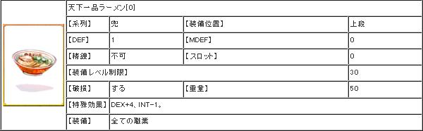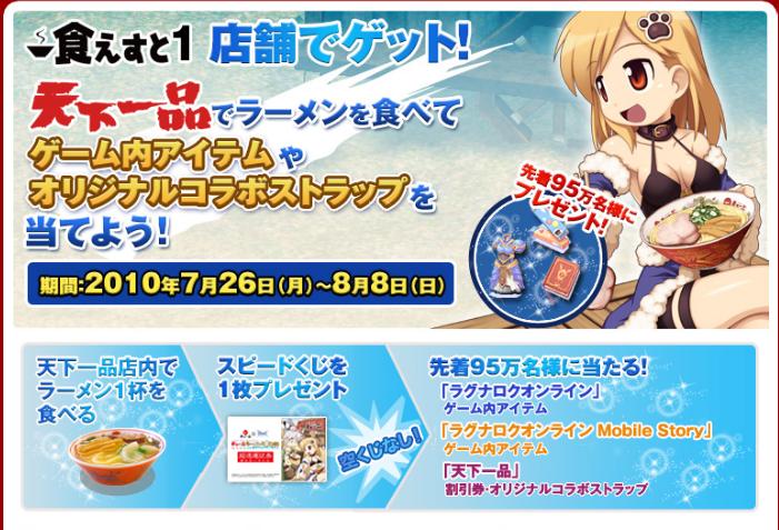 RO【ただの日記編】 2010/07/17 やっぱやんのかこのイベント カンファレンスの時に書いてた『天下一品』とのコラボ どうやら来るようですね。 もらえるハズレなしのクジの内容はー こんなんとか…あとはゴスリンカードとか色々。 詳しくは特設ページへどうぞ ⇒ttp://www.ragnarokonline.jp/news/event/cp_tenkaippin/kuji.html ゲーム内でも天一ができるらしい。 消耗品みたいなアイテムも出るらしい。またオモチみたいなのかな? 公式特設ページに、天下一品ラーメン[0]は手に入れましたか?装備してから来てくださいね。 って書いてたので、装備して行ったら何かあるのでしょうか。 天下一品に行く事はできるけど、ゲーム内の状況については確かめれないので誰かのブログで詳細書いてくれる事を楽しみにしております! さぁラグナロクを知らない会社、学校の周りの人を誘って天下一品へ行きたまへ! そしてそのチケット(友達が欲しがってたので)クダサイとか言えばいいよ! 心の中では友達=おまえだろう?って思われるに違いない!