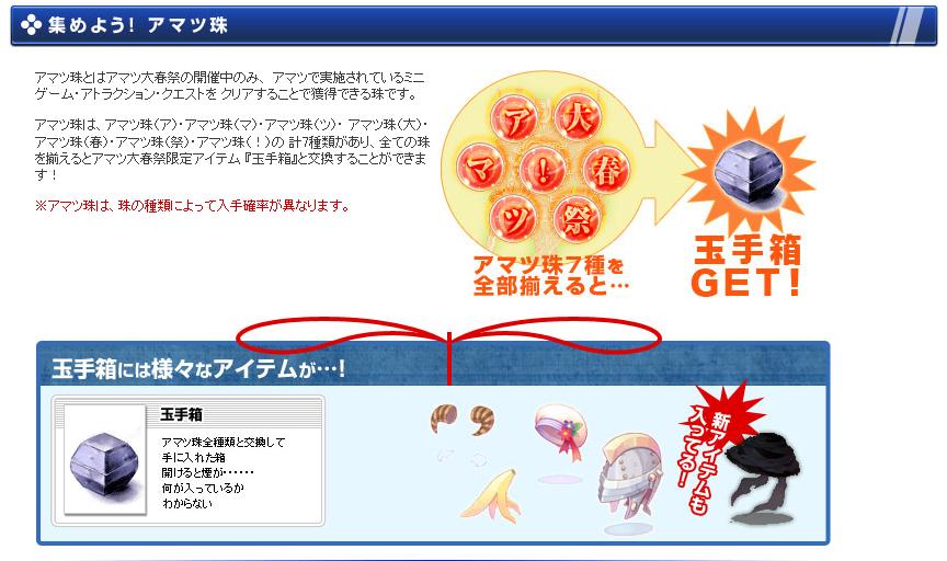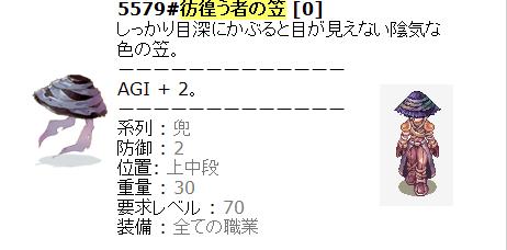 RO【ただの日記編】 2010/04/12 玉手箱たぶんこれっしょ? ※4/13追記 天津祭りみたいなイベントが開催されるそうです。 (URLコピペするのわすれた。公式みてね☆ミ) で、そのイベントでこんなのがあるらしい。 ※画像クリックで拡大します。 それで新アイテムって書いてるシルエットのありますよね? 多分これだと思われます。 彷徨う者の笠。 ドット絵も載せてみました。(笠なのでアサシンで…) 性能はそのまま来るのかどうかは分かりません。 今の日本だったらスロットつけてくれてもいいのになーって思う。 玉手箱の中身の一例で書いてる画像は、おそらく…サキュ角、バルーン、バナナの皮、ヘルムぽい。 バルーン暴落フラグ? ※4/13追記 日本仕様の笠はこの性能らしい? しっかり目深にかぶると 目が見えない陰気な色の笠。 ――――――――――――― Flee + 3。 ――――――――――――― 精 錬値が 5以上の時、 追加でFlee + 5。 ――――――――――――― 精錬値が 7以上の時、 追加でFlee + 2、Agi + 2。