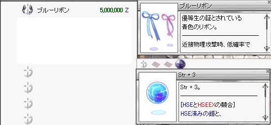 RO【ただの日記編】 2010/02/01 STR3ブルーリボン 露店でみかけた。 安くね?くね? 低確率で集中力向上も出るし、パッシブ職には!? 見た目も悪くないし…。 未精錬、未HSEのブルーリボンが1Mくらいだから、お安い方だと思った。 あ、それだけなんです。 なんかお手ごろ価格じゃね?って思ったんで…。 そうそう しめじ様にSWでハートを作ってもらった! ggたまがWIZたま掛けてたのでお願いしたのだった。 作れない…とかいっちゃってーふふふ きれいに作れてるジャネーカ!