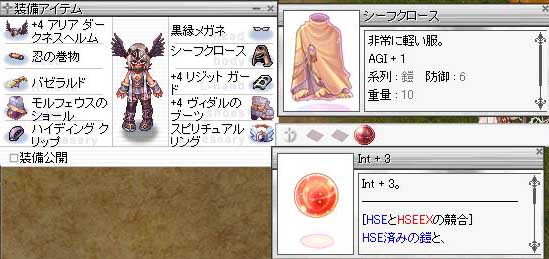 RO【ただの日記編】 2010/02/01 朝練 装備少し変えたので、朝の家出る前に1ペナするまでという限定ミッションで行ってみた。 装備はこんな感じ。 相変わらず未精錬だったり寄せ集めだったり…。 シフクロにはまだ何も挿してまセン。 フレイムスカル盾と石化服は龍炎狩りの邪魔になるので今回はナシ。 行く場所は時間もないので ピンギは刺激がまったくない作業だし、WIZさんとかも居るのでネ。 マヌクは落ち着いて集中しないとミスってしまうし! って事でナーガさん。 馬は襲ってこないし、ダークピンギは数少ないし足遅いで、ナーガさんの邪魔しないのでいい子。 SP回復剤にもなってくれるし…。 慣れてきたので画像のように2対や3対きても どーん! うまし!! ナーガさんのEXPは BASE 30,360 JOB 16,348 なのでうまし! M単位のレアないけどネ。 未だにWBされた事ないんだけど、どういう状況でしてくるんですか…? されるまで装備作る気もナイので何の対策もシテナイ。 途中で気づいた…ちょい前から薄々きづいてたけど… 龍炎はダブルやトリプルヒット狙いになるので、INTをあげるよりもどれだけ確実に複数ヒットを入れれるかに限るのだと思った。 だから途中で、黒メガネから闇目に換装した…。 しかしこれ思ったんだけど、ダークネスヘルム優秀ダナ。 りんごorラーメン ⇒ アイシラ頭 に換装すると、次撃つ時にまた詠唱装備にした時アイシラ発動チャンスを逃すわけですが、中段を闇目 ⇒ 黒メガネにすると常時アイシラ発動チャンスだ! 龍炎狩りするならINTをワンランク下げても詠唱装備の方がいいのかもシレナイ。 どっちみち火炎は詠唱早いし、すいとんの詠唱もあがるシネ。